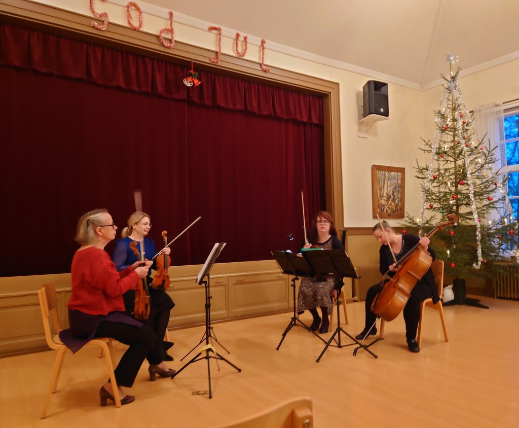 Feststämningen tog emot publiken redan på gården till Solbacka när Agricolasällskapet i Pernå äntligen kunde fira sitt 15-årsjubileum. Inne i salen väntade instrument på att få ljuda i sällskap av en ståtlig julgran.