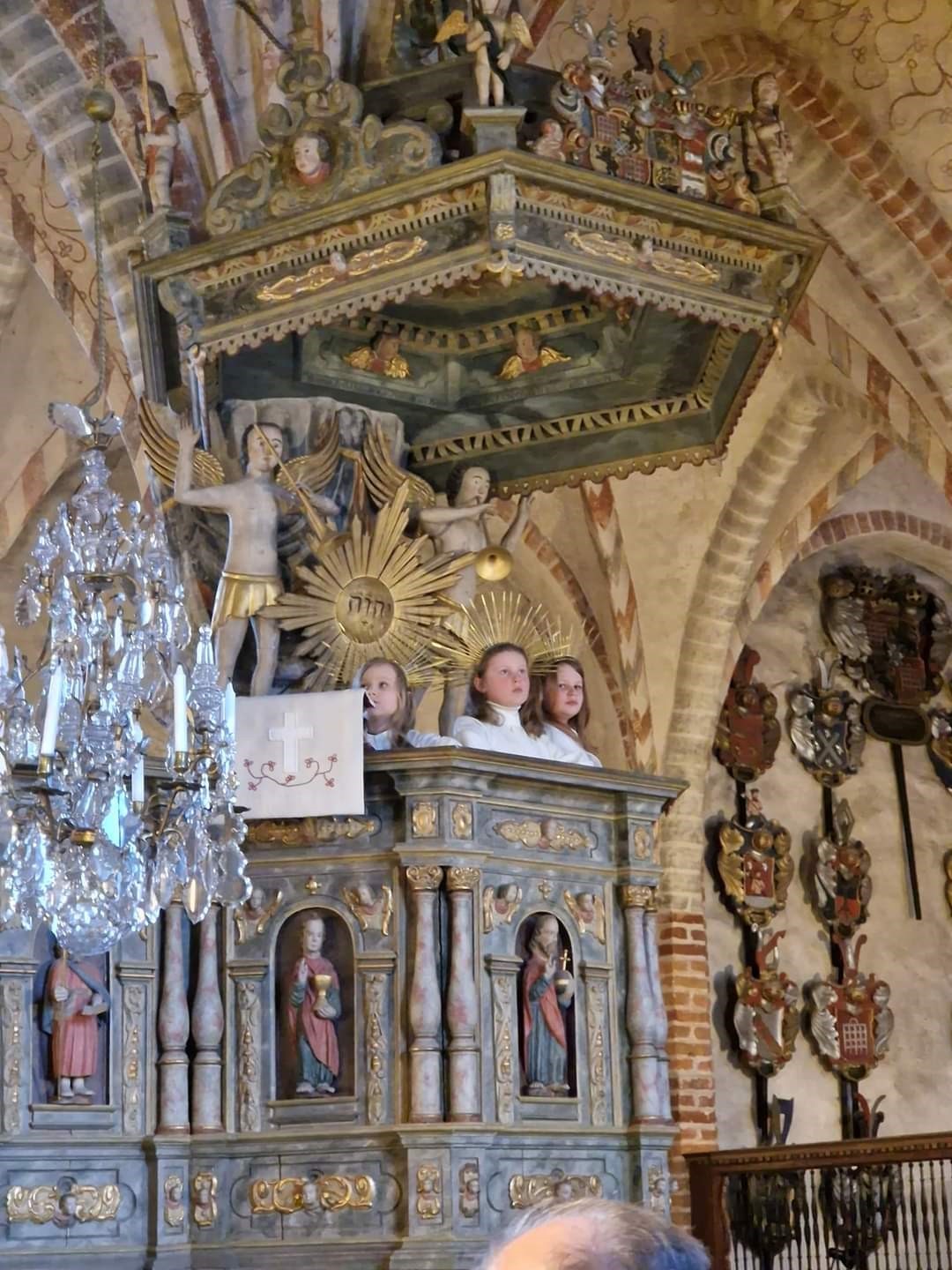 ”Änglarna” Lianna Selín, Minja Heinonen och Jade Saraste i Pernå kyrkas predikstiol.- Foto Kaika Selín.