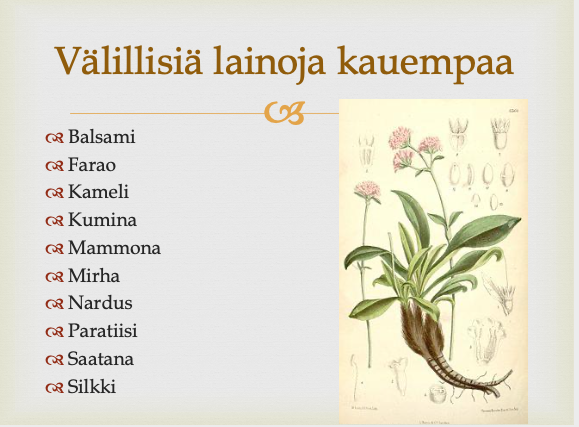 Esimerkkitaulu kielitieteilijä Kaisa Häkkisen esitelmästä Itää ja länttä Agricolan kielessä Pernajan Agricola-Seuran juhlaseminaarissa 29.9.2017.